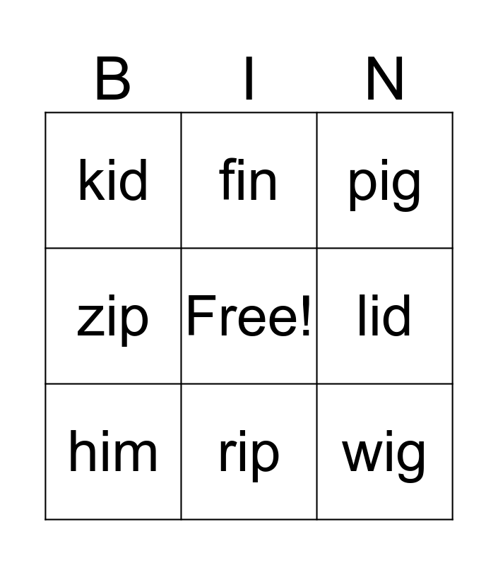This bingo card has a free space and 8 words: lid, pig, fin, him, kid, wig, zip and rip.