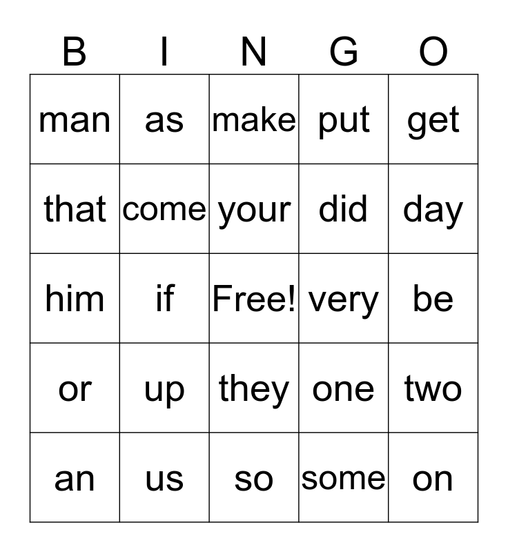 This bingo card has a free space and 24 words: up, us, your, an, get, man, that, as, very, they, did, him, one, two, come, some, be, make, day, if, on, or, put and so.