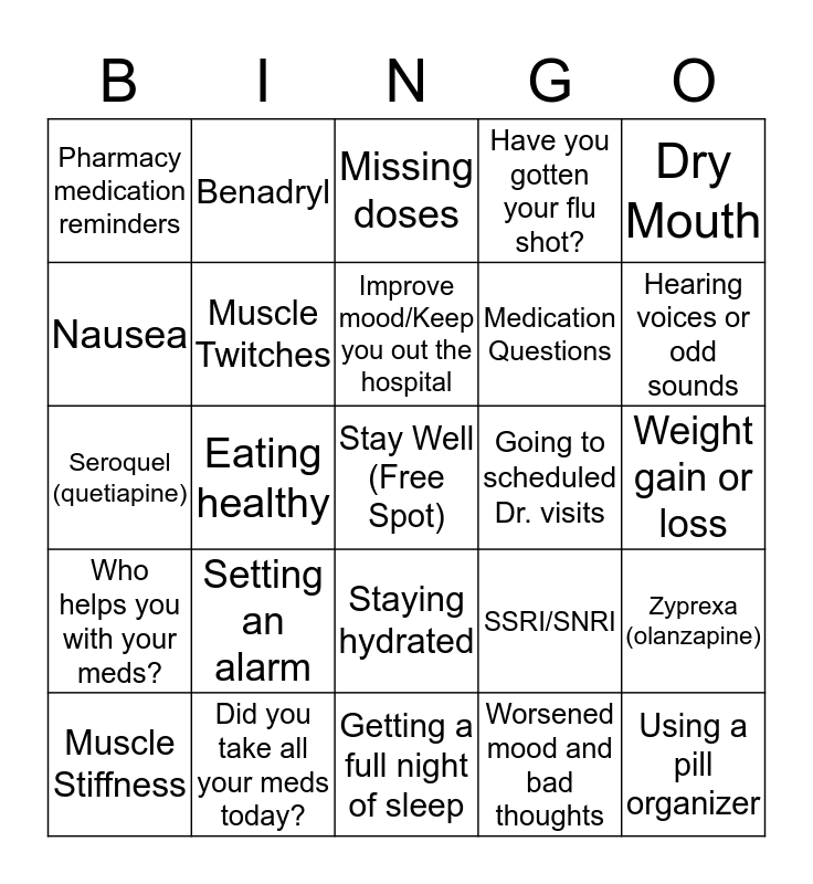 This bingo card has a free space and 24 words: Muscle Stiffness, Setting an alarm, Improve mood/Keep you out the hospital, Worsened mood and bad thoughts, Dry Mouth, Pharmacy medication reminders, Benadryl, Missing doses, Going to scheduled Dr. visits, Weight gain or loss, Seroquel (quetiapine), Muscle Twitches, SSRI/SNRI, Zyprexa (olanzapine), Nausea, Did you take all your meds today?, Getting a full night of sleep, Have you gotten your flu shot?, Hearing voices or odd sounds, Who helps you with your meds?, Eating healthy, Staying hydrated, Medication Questions and Using a pill organizer.
