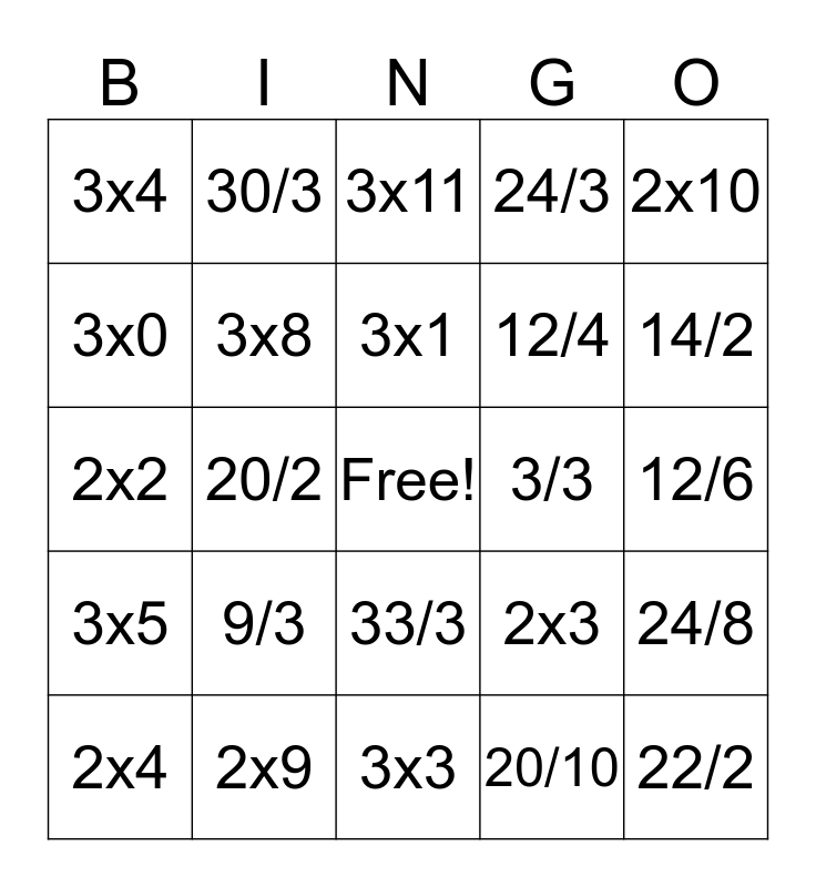 This bingo card has a free space and 50 words: 2x11, 22/2, 22/11, 3x3, 9/3, 3x10, 30/3, 30/10, 3x0, 0/3, 3x8, 24/3, 24/8, 2x3, 6/2, 6/3, 3x1, 3/3, 3/1, 2x10, 20/2, 20/10, 3x4, 12/4, 12/3, 2x7, 14/2, 14/7, 3x11, 33/3, 33/11, 3x9, 27/3, 27/9, 2x9, 18/9, 18/2, 2x6, 12/2, 12/6, 3x6, 2x1, 2x8, 3x2, 2x4, 2x2, 2x5, 2x0, 3x5 and 3x7.