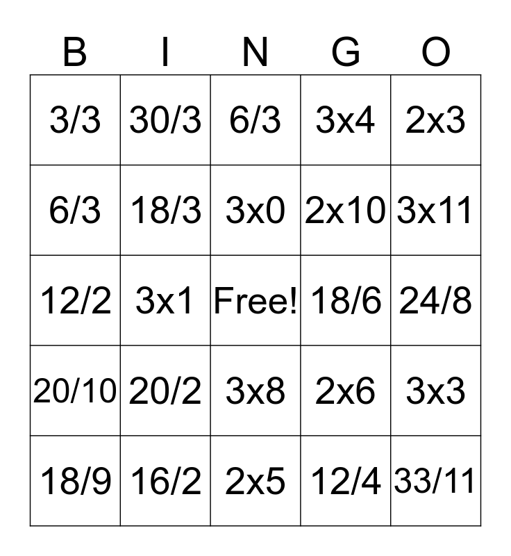 This bingo card has a free space and 67 words: 2x11, 22/2, 22/11, 3x3, 9/3, 3x10, 30/3, 30/10, 3x0, 0/3, 3x8, 24/3, 24/8, 2x3, 6/2, 6/3, 3x1, 3/3, 3/1, 2x10, 20/2, 20/10, 3x4, 12/4, 12/3, 2x7, 14/2, 14/7, 3x11, 33/3, 33/11, 3x9, 27/3, 27/9, 2x9, 18/9, 18/2, 2x6, 12/2, 12/6, 3x6, 18/3, 18/6, 2x1, 2/1, 2/2, 2x8, 16/2, 16/8, 3x2, 6/3, 6/2, 2x4, 2x2, 4/2, 2x5, 10/2, 10/5, 2x0, 0/2, 2/0, 3x5, 15/3, 15/5, 3x7, 21/7 and 21/3.