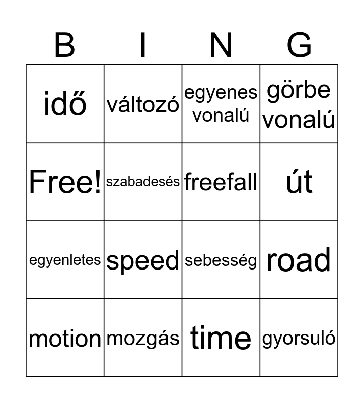 This bingo card has 18 words: Free!, mozgás, egyenes vonalú, görbe vonalú, egyenletes, változó, sebesség, út, idő, speed, time, road, motion, szabadesés, freefall, gyorsuló, gyorsulás and lassuló.