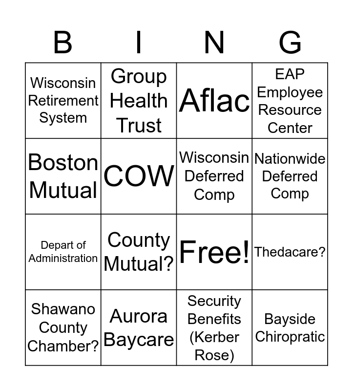This bingo card has 21 words: Aurora Baycare, Employee Benefits Corporation (EBC), Group Health Trust, Delta Dental, Security Benefits (Kerber Rose), Wisconsin Deferred Comp, Wisconsin Retirement System, Aflac, Free!, Nationwide Deferred Comp, Depart of Administration, EAP Employee Resource Center, Bayside Chiropratic, Verkuilen Chiropractic, COW, Public Health Flu Shot, Shawano County Chamber?, County Mutual?, Boston Mutual, Thedacare? and Bellin Fastcare?.