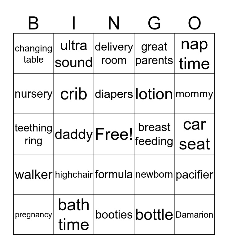 This bingo card has a free space and 24 words: highchair, bath time, diapers, pregnancy, nap time, changing table, nursery, ultra sound, breast feeding, formula, lotion, teething ring, newborn, pacifier, crib, bottle, car seat, delivery room, mommy, daddy, Damarion, walker, great parents and booties.