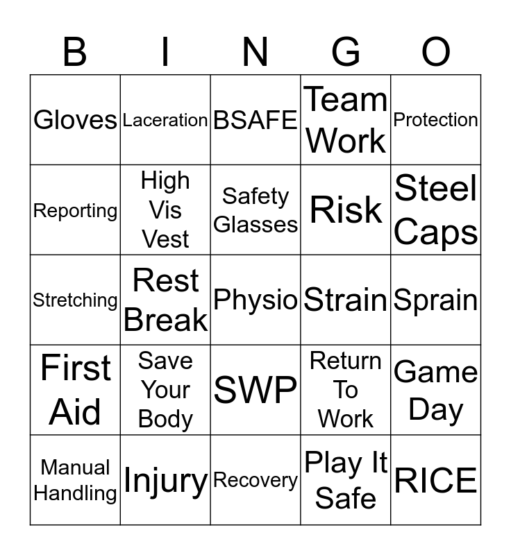This bingo card has 25 words: Save Your Body, Recovery, Safety Glasses, Manual Handling, Protection, Gloves, Reporting, Laceration, Strain, SWP, Risk, Stretching, Return To Work, Game Day, High Vis Vest, RICE, Sprain, BSAFE, Steel Caps, Rest Break, Physio, Injury, First Aid, Team Work and Play It Safe.