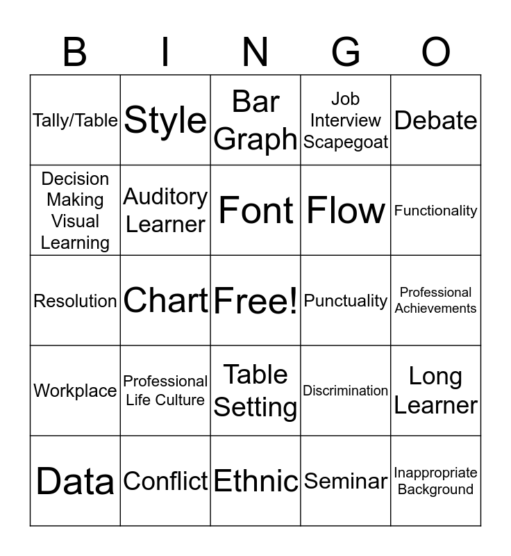 This bingo card has a free space and 28 words: Long Learner, Flexible Expenses, Flow, Seminar, Decision Making Visual Learning, Bar Graph, Style, Workplace, Punctuality, Data, Resolution, Job Interview Scapegoat, Conflict, Ethnic, Functionality, Manipulative, Professional Life Culture, Auditory Learner, Font, Table Setting, Tally/Table, Diverse, Inappropriate Background, Chart, Professional Achievements, Discrimination, Debate and Hands On learner.