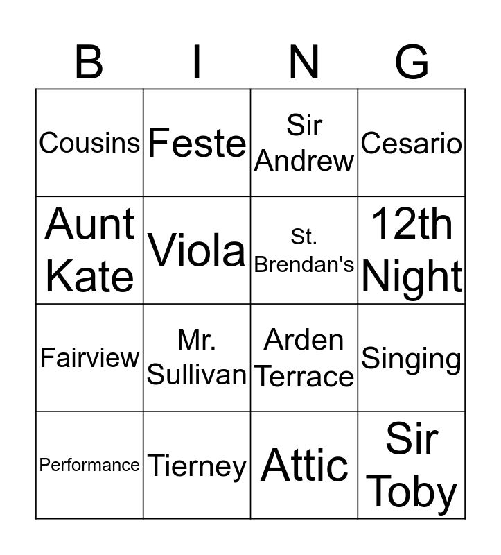 This bingo card has 26 words: Rogan, Madeline, 12th Night, Shakespeare, Aunt Kate, Cousins, Viola, Feste, Attic, Theater, Fairview, Arden Terrace, Orsino, Sebastian, Singing, Maria, Cesario, Sir Toby, Sir Andrew, Performance, Mr. Sullivan, Secretive, Tierney, Glamourous, St. Brendan's and Magic.