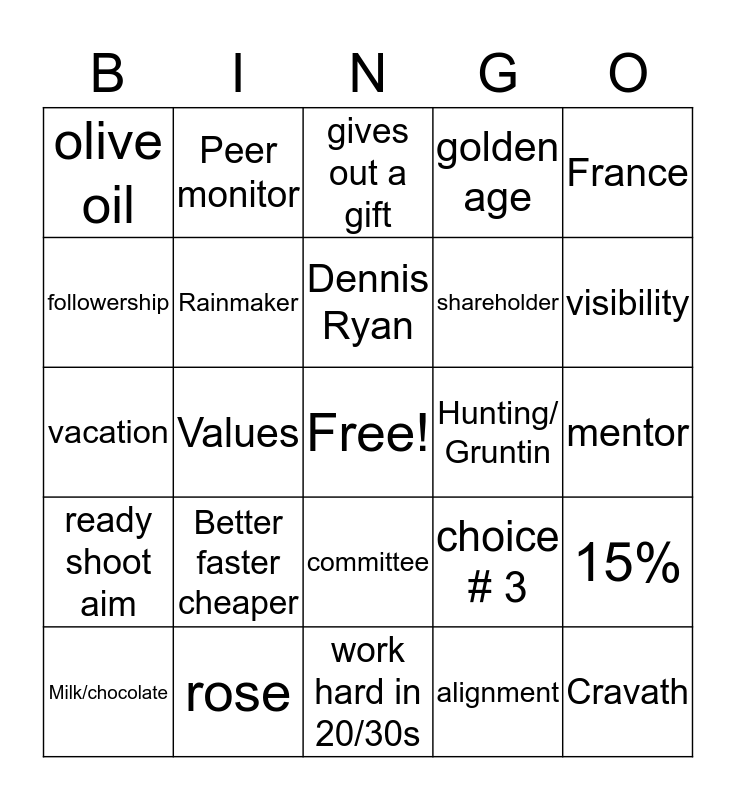 This bingo card has a free space and 24 words: Better faster cheaper, rose, Dennis Ryan, Milk/chocolate, France, olive oil, followership, Peer monitor, Hunting/ Gruntin, committee, shareholder, vacation, choice # 3, 15%, Rainmaker, alignment, mentor, gives out a gift, visibility, Values, Cravath, ready shoot aim, golden age and work hard in 20/30s.