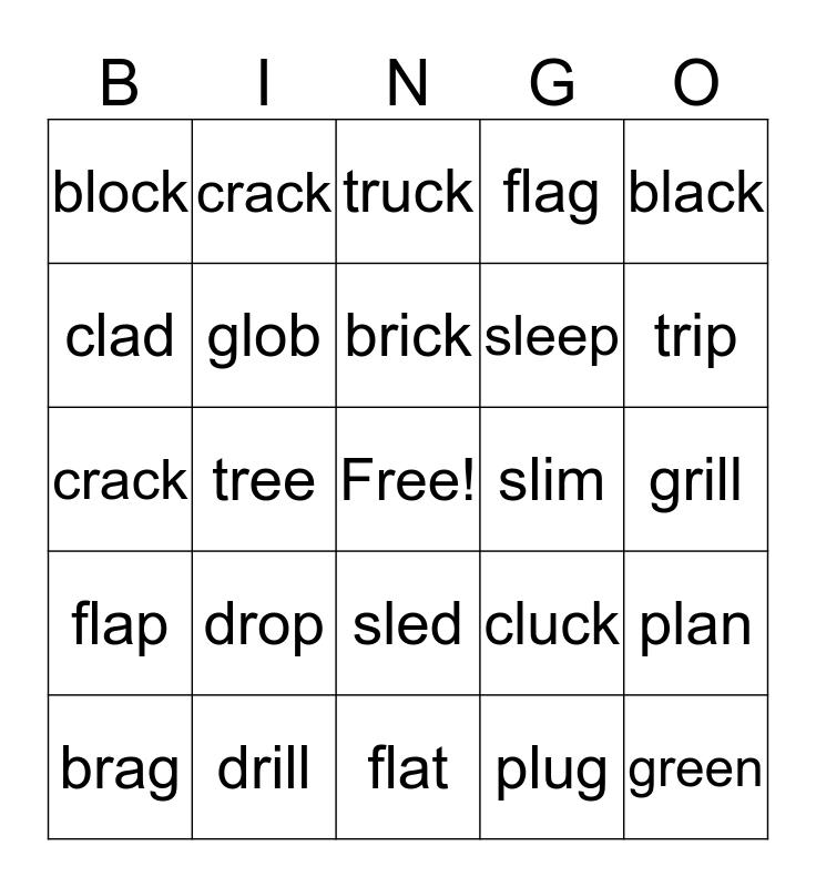 This bingo card has a free space and 24 words: drop, drill, brick, brag, black, block, clad, crack, slim, sled, sleep, crack, cluck, plan, glob, plug, grill, truck, trip, tree, green, flap, flag and flat.
