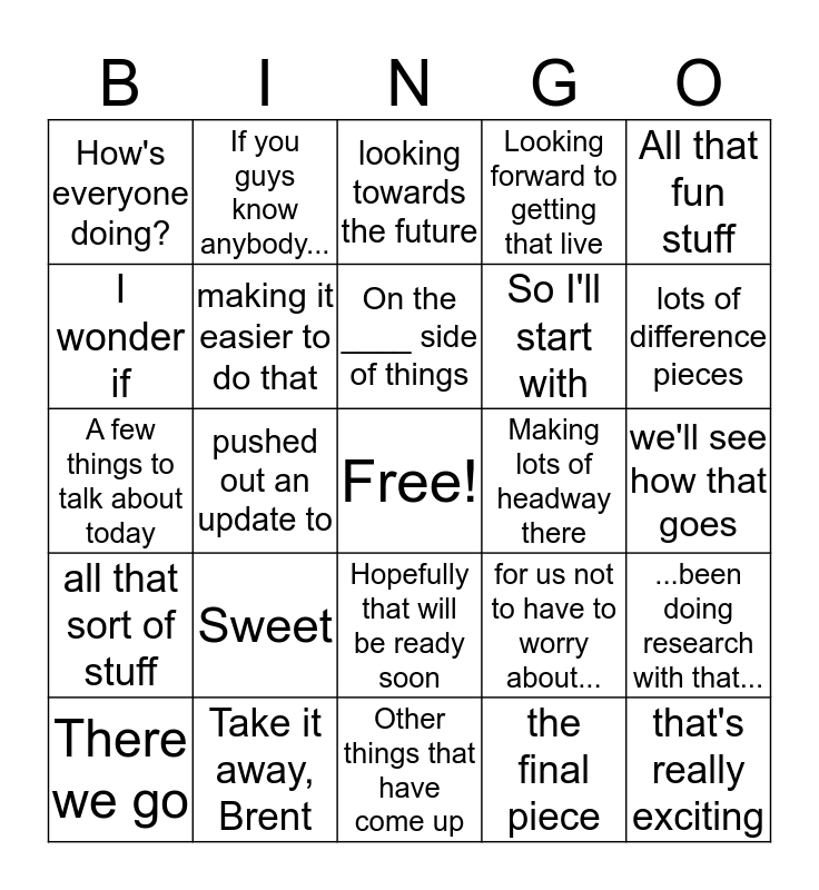 This bingo card has a free space and 24 words: Sweet, Take it away, Brent, On the ____ side of things, There we go, All that fun stuff, How's everyone doing?, I wonder if, If you guys know anybody..., Making lots of headway there, Hopefully that will be ready soon, So I'll start with, A few things to talk about today, for us not to have to worry about..., ...been doing research with that..., making it easier to do that, the final piece, we'll see how that goes, looking towards the future, lots of difference pieces, pushed out an update to, that's really exciting, all that sort of stuff, Looking forward to getting that live and Other things that have come up.