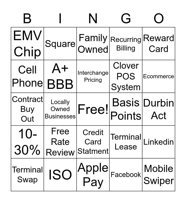 This bingo card has a free space and 24 words: Free Rate Review, ISO, Interchange Pricing, Terminal Swap, Reward Card, EMV Chip, Cell Phone, Square, Basis Points, Credit Card Statment, Clover POS System, Contract Buy Out, Terminal Lease, Linkedin, A+ BBB, Facebook, Durbin Act, Family Owned, Ecommerce, Locally Owned Businesses, Mobile Swiper, 10-30%, Recurring Billing and Apple Pay.