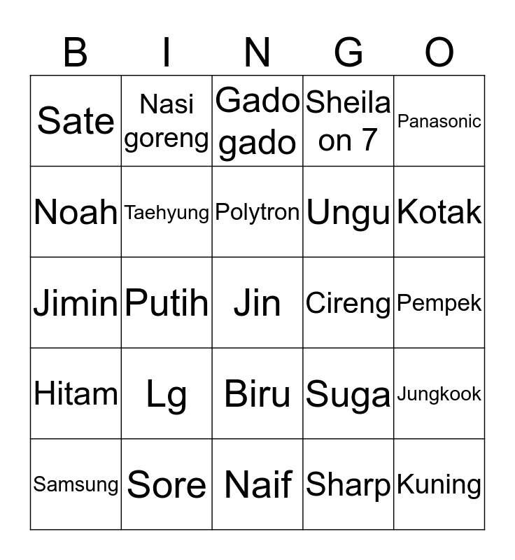 This bingo card has a free space and 24 words: Samsung, Lg, Polytron, Sharp, Panasonic, Sate, Nasi goreng, Gado gado, Cireng, Pempek, Jimin, Taehyung, Suga, Jungkook, Noah, Sore, Naif, Sheila on 7, Kotak, Hitam, Putih, Biru, Ungu and Kuning.