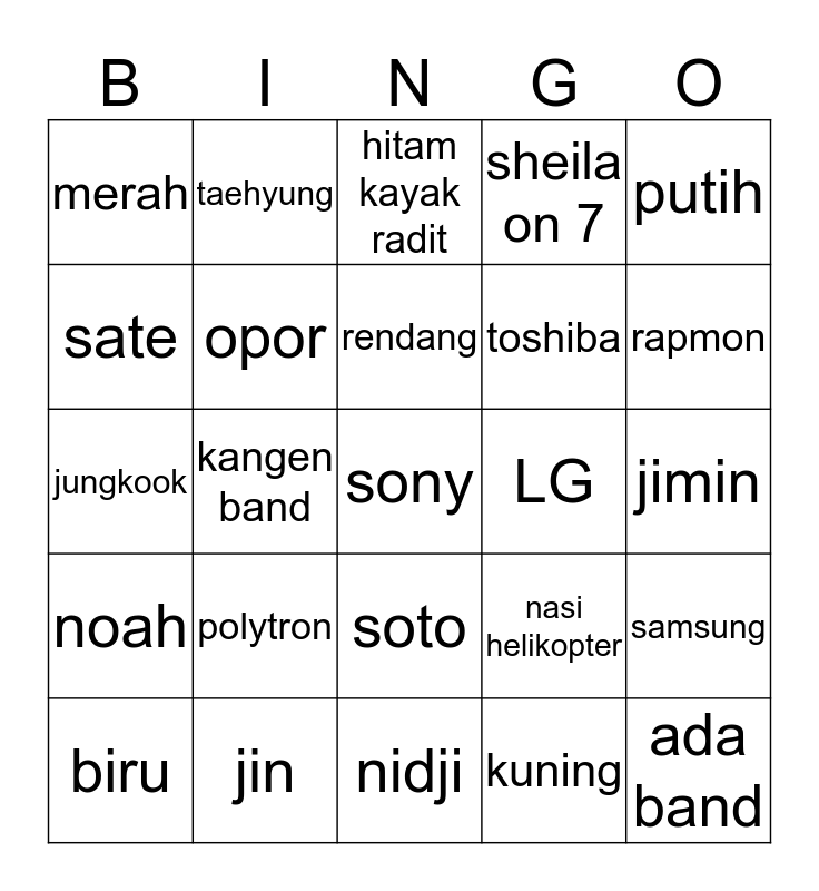 This bingo card has a free space and 24 words: polytron, jin, rendang, biru, putih, merah, sate, taehyung, LG, soto, toshiba, jungkook, nasi helikopter, samsung, opor, kuning, jimin, hitam kayak radit, rapmon, kangen band, ada band, noah, sheila on 7 and nidji.