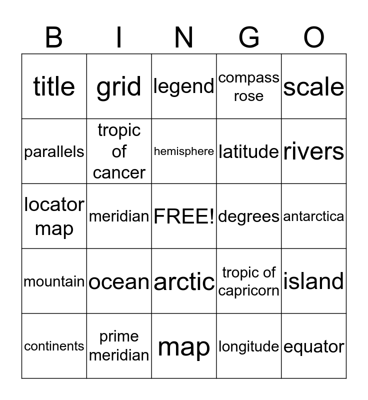 This bingo card has a free space and 24 words: ocean, prime meridian, hemisphere, continents, scale, title, parallels, grid, degrees, arctic, latitude, locator map, tropic of capricorn, island, tropic of cancer, longitude, antarctica, legend, rivers, meridian, equator, mountain, compass rose and map.