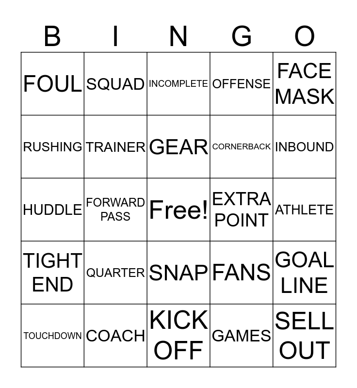 This bingo card has a free space and 100 words: ALL-STAR, ANNOUNCER, ATHLETE, BACKFIELD, BLINDSIDE, BLITZ, BLOCKERS, CALL, CARRIER, CATCHES, CHAMPION, CHEERS, CLIPPING, COACH, COIN TOSS, CONFERENCE, CORNERBACK, DEFENSIVE, DELAY OF GAME, DISPUTE, DOWN, DOWNFIELD, DROP BACK, END-ZONE, EQUIPMENT, EXTRA POINT, FACE MASK, FANS, FIELD GOAL, FIELD JUDGE, FORWARD PASS, FOUL, FULLBACK, FUMBLE, GAMES, GEAR, GOAL LINE, GUARD, HALFTIME, HANDOFF, HEISMAN TROPHY, HOLDING, HUDDLE, ILLEGAL PROCEDURE, INBOUND, INCOMPLETE, INELIGIBLE, INTERCEPTION, INTERFERENCE, KICK OFF, LATERAL PASS, LEAGUE, LIMELIGHT, LINEBACKER, LINEMAN, LINEMEN, LOCKER ROOM, MANAGER, NFL, OFFENSE, OFFSIDE, OUT OF BOUNDS, PASSES, PENALTY, PIGSKIN, PLACEKICKER, PLAYERS, PLAYOFFS, POSSESSION, POST SEASON, PUNT, QUARTER, QUARTERBACK, RANKING, RED SHIRT, REFEREE, RUNNING BACK, RUSHING, SAFETY, SCORE, SCRIMMAGE, SELL OUT, SIDELINES, SNAP, SPORTSMANSHIP, SQUAD, SUPER BOWL, TACKLE, TEAM, TIGHT END, TIMEOUT, TITLE, TOUCHBACK, TOUCHDOWN, TRAINER, TURNOVER, TWO POINT CONVERSION, UNIFORMS, WORKOUT and ZONE.