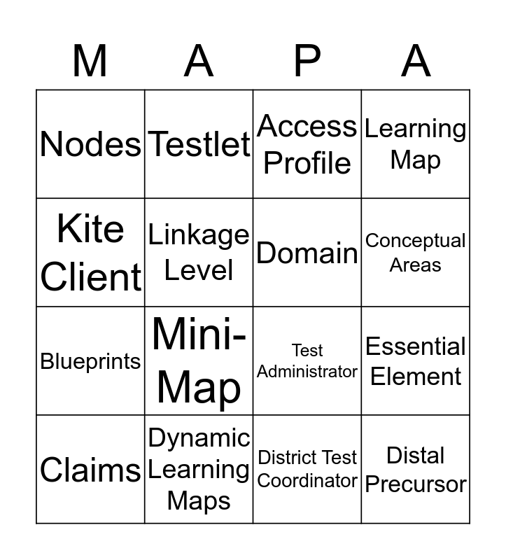 This bingo card has 16 words: Dynamic Learning Maps, Essential Element, Access Profile, Nodes, Blueprints, Testlet, Test Administrator, District Test Coordinator, Kite Client, Linkage Level, Claims, Learning Map, Mini-Map, Conceptual Areas, Domain and Distal Precursor.