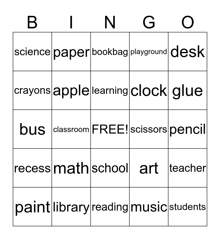 This bingo card has a free space and 24 words: math, library, learning, paint, desk, science, crayons, paper, scissors, school, clock, bus, art, teacher, apple, music, pencil, bookbag, glue, classroom, students, recess, playground and reading.