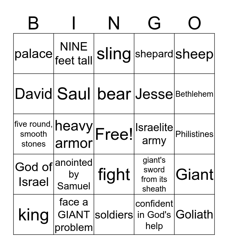 This bingo card has a free space and 24 words: anointed by Samuel, face a GIANT problem, bear, king, sheep, palace, David, NINE feet tall, Israelite army, fight, Jesse, five round, smooth stones, giant's sword from its sheath, Giant, Saul, confident in God's help, Philistines, sling, Bethlehem, heavy armor, Goliath, God of Israel, shepard and soldiers.