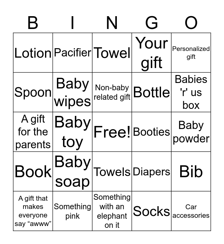 This bingo card has a free space and 28 words: Bib, Blanket, Bottle, Socks, Spoon, Towel, Pacifier, Book, Booties, A gift that makes everyone say “awww”, A gift for the parents, Your gift, Something pink, Something with an elephant on it, Babies 'r' us box, Gift card, Baby soap, Baby wipes, Non-baby related gift, Towels, Lotion, Food/snacks, Car accessories, Baby toy, Baby powder, Diapers, Personalized gift and A gift for Cookie.