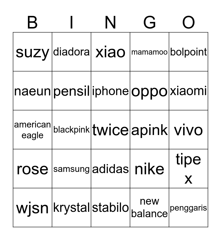 This bingo card has a free space and 24 words: samsung, krystal, iphone, wjsn, bolpoint, suzy, naeun, diadora, apink, adidas, oppo, american eagle, nike, tipe x, pensil, new balance, vivo, xiao, xiaomi, blackpink, penggaris, rose, mamamoo and stabilo.