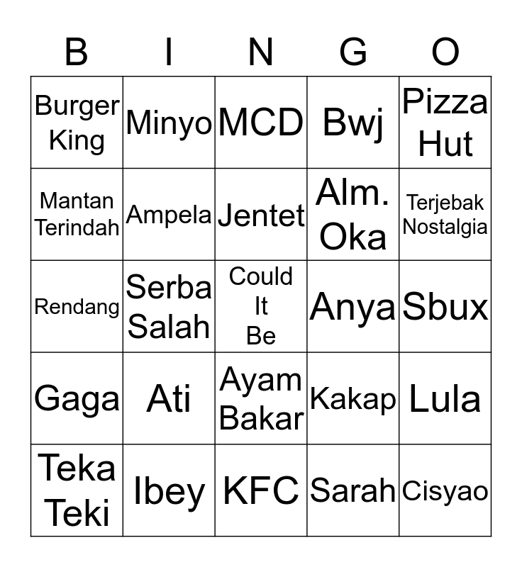 This bingo card has a free space and 24 words: Ati, Ibey, Jentet, Teka Teki, Pizza Hut, Burger King, Mantan Terindah, Minyo, Anya, Ayam Bakar, Alm. Oka, Rendang, Kakap, Lula, Ampela, Sarah, Sbux, MCD, Terjebak Nostalgia, Serba Salah, Cisyao, Gaga, Bwj and KFC.