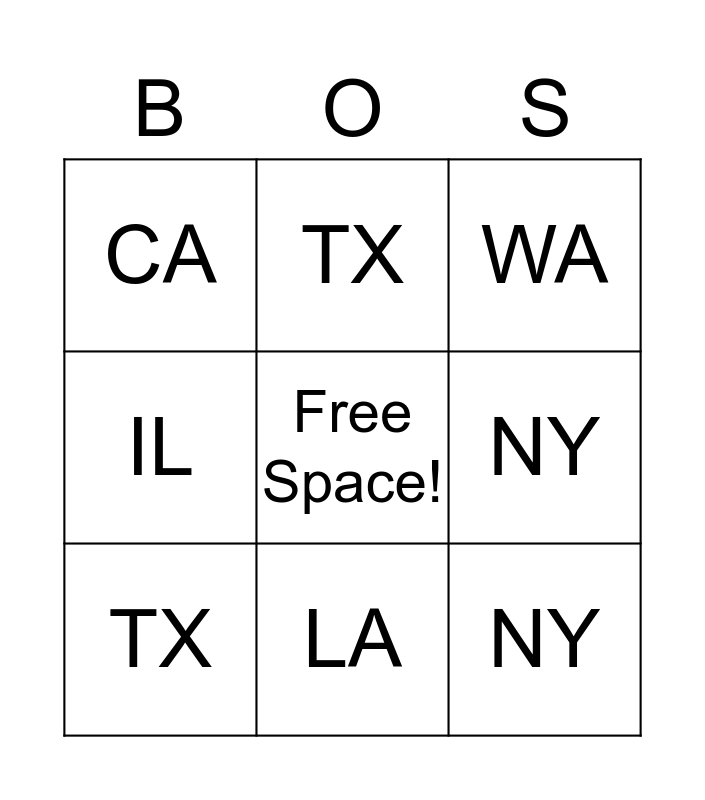 This bingo card has a free space and 8 words: NY, WA, TX, TX, CA, NY, IL and LA.