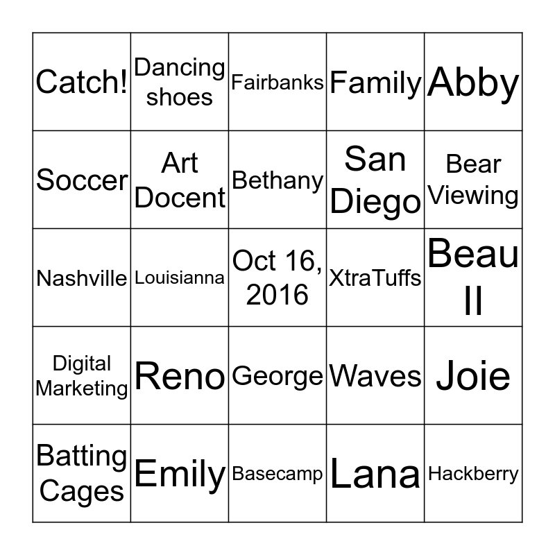 This bingo card has 84 words: Talkeetna, Mt. McKinley, Fairbanks, Little League, The Scooby Doo Rod, Truckee, 30-lb King Salmon, Airports, Target Practice, Running horses, Weaving Bracelets, Good Friends, Art Docent, XtraTuffs, Red Rock Canyon, Catch!, Batting Cages, Soccer, Salmon Conservation, Maui, Jan 5, 2017, San Diego, Oct 16, 2016, Afognak Island, Louisianna, Jan 14, 2018, May 30, 2017, Roseville, Oahu, Waimea Rock, Reno, Las Vegas, Kodiak, Nashville, Hackberry, Cross- Country Skiing, Basecamp, Deep Sea Fishing, Bear Viewing, Digital Marketing, Wildlife Photography, Snorkeling, Photojournalism, Ziplining, Horseback Riding, Hiking Boots, Dancing shoes, Live Music, Water Slides, River Crossing, Denali National Park, Waves, Family, Beau, Rhonda, Casey, Emily, Bethany, Kourtney, Beau II, Tinder, Rafael, Ethan, Calvin, Makaila, Emilie, Ben, Megan, Abby, Ryan, Joie, Brian, Terry, Carol, George, Lana, Jamie, Shannon, Lyndee, Steve, Daniel, Katie, Luke and Love.