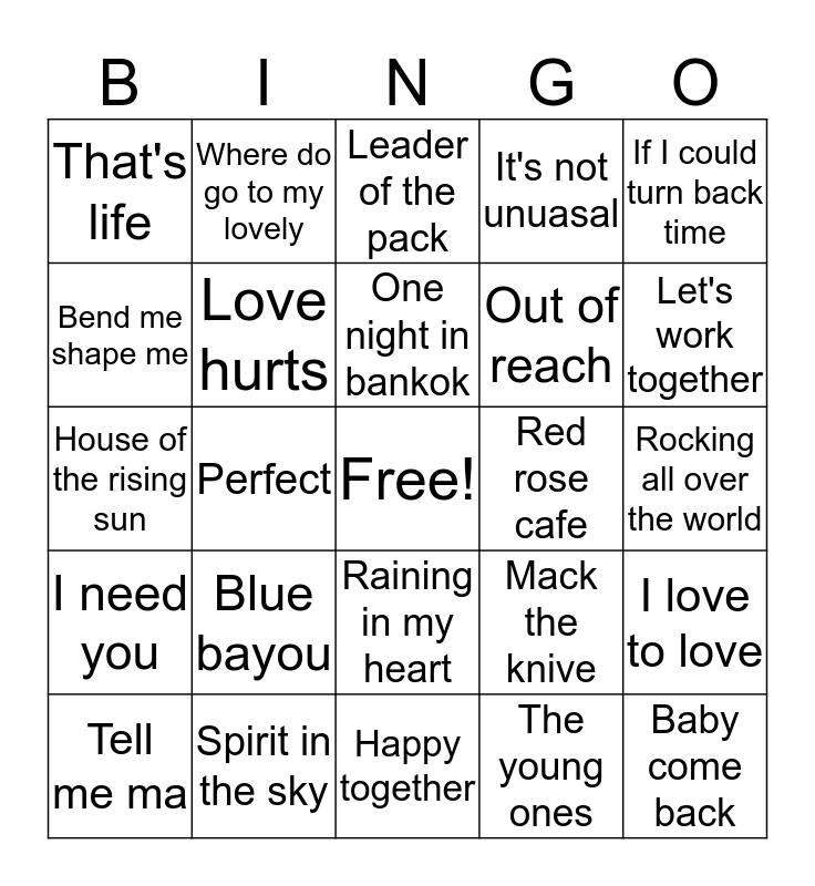 This bingo card has a free space and 44 words: American pie, Baby come back, That's Alrite mama, Tell me ma, Baby now that I've found you, The young ones, Leader of the pack, Princess in rags, If I could turn back time, Spirit in the sky, It's not unuasal, Red rose cafe, Raining in my heart, Blue bayou, In the year 2525, Happy together, I will survive, House of the rising sun, Silly love songs, Let's work together, Where do go to my lovely, The only way is up, Private dancer, That's life, tainted love, Rocking all over the world, Pearls a singer, Glad all over, Mack the knive, I need you, Patsy Fagan, I love to love, Part time lover, Ghostbusters, Perfect, Jackson, Penny lane, One that I want, One night in bankok, Bend me shape me, Out of reach, Bony moronie, Love hurts and Oh carol.