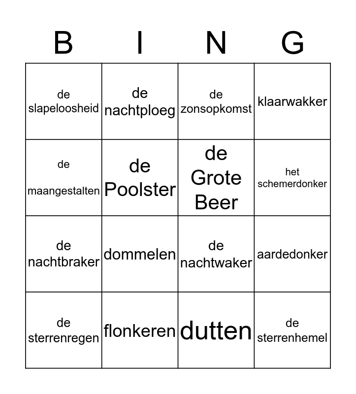 This bingo card has 20 words: de sterrenregen, de zonsondergang, de zonsopkomst, aardedonker, doezelen, dommelen, dutten, klaarwakker, de nachtbraker, de nachtploeg, de nachtwaker, het schemerdonker, de slapeloosheid, flonkeren, de Grote Beer, het heelal, de maangestalten, de Poolster, het sterrenbeeld and de sterrenhemel.