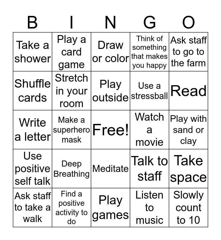 This bingo card has a free space and 24 words: Deep Breathing, Find a positive activity to do, Play outside, Ask staff to take a walk, Ask staff to go to the farm, Take a shower, Shuffle cards, Play a card game, Watch a movie, Meditate, Use a stressball, Write a letter, Talk to staff, Take space, Stretch in your room, Listen to music, Play with sand or clay, Draw or color, Read, Make a superhero mask, Slowly count to 10, Use positive self talk, Think of something that makes you happy and Play games.
