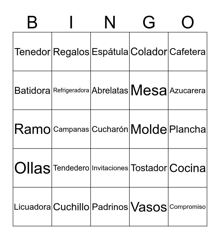 This bingo card has 60 words: Cuchara, Cuchillo, Sartén, Ollas, Vasos, Horno, Refrigeradora, Taza, Mesa, Mantel, Colador, Esponja, Batidora, Microondas, Pichel, Tenedor, Cucharón, Cafetera, Platos, Abrelatas, Molde, Espátula, Licuadora, Cocina, Lavadora, Televisor, Cortina, Alfombra, Azucarera, Copas, Olla arrocera, Olla a presión, Desayunador, Velo, Regalos, Pastel de bodas, Iglesia, Campanas, Anillos, Ramo, Luna de miel, Tendedero, Plancha, Paños, Tostador, Arras, Delantal, Traje, Sacerdote, Invitaciones, Padrinos, Amor, Familia, Marcha nupcial, Baile, La liga, Rosario, Respeto, Compromiso and Baile.