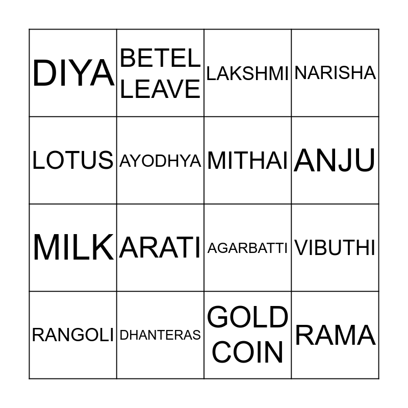 This bingo card has 30 words: HANUMAN, SINDOOR, VIBUTHI, FIREWORKS, DIYA, LAKSHMI, MITHAI, SWASTIKA, DHANTERAS, POOJA THALI, GOLD COIN, RANGOLI, COCONUT, GANESHA, ARATI, RAVANA, SITA, RAMA, DIWALI, LOTUS, AGARBATTI, CAMPHOR, BETEL LEAVE, MILK, AYODHYA, NARISHA, ISHNA, LUV, ANJU and NARESH.