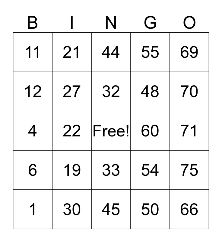 This bingo card has a free space and 24 words: 1, 19, 32, 50, 69, 11, 21, 44, 60, 71, 4, 27, 54, 75, 12, 30, 45, 55, 70, 6, 22, 33, 48 and 66.