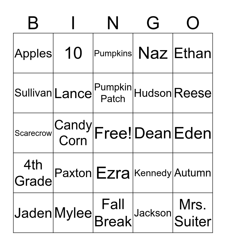 This bingo card has a free space and 24 words: Paxton, Mylee, Pumpkin Patch, Jaden, Ethan, Apples, Sullivan, 10, Dean, Ezra, Hudson, Scarecrow, Kennedy, Autumn, Lance, Jackson, Eden, Pumpkins, Reese, Candy Corn, Mrs. Suiter, 4th Grade, Naz and Fall Break.