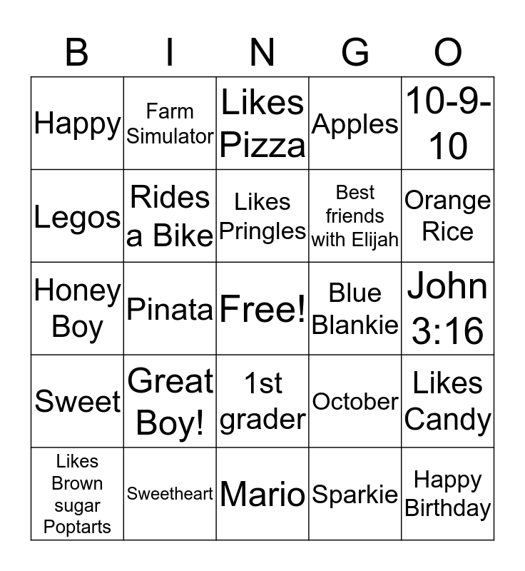 This bingo card has a free space and 24 words: Great Boy!, Sweetheart, Likes Pringles, Likes Brown sugar Poptarts, 10-9-10, Happy, Legos, Farm Simulator, Blue Blankie, 1st grader, Best friends with Elijah, Honey Boy, October, Likes Candy, Rides a Bike, Sparkie, John 3:16, Likes Pizza, Orange Rice, Pinata, Happy Birthday, Sweet, Apples and Mario.