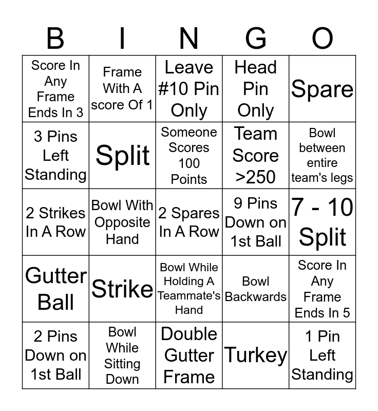 This bingo card has 25 words: Strike, Double Gutter Frame, Someone Scores 100 Points, 2 Pins Down on 1st Ball, Spare, Score In Any Frame Ends In 3, 3 Pins Left Standing, Frame With A score Of 1, 9 Pins Down on 1st Ball, Bowl While Holding A Teammate's Hand, Team Score >250, 2 Strikes In A Row, Bowl Backwards, Score In Any Frame Ends In 5, Split, 1 Pin Left Standing, 7 - 10 Split, Leave #10 Pin Only, Bowl between entire team's legs, Bowl With Opposite Hand, 2 Spares In A Row, Bowl While Sitting Down, Gutter Ball, Head Pin Only and Turkey.