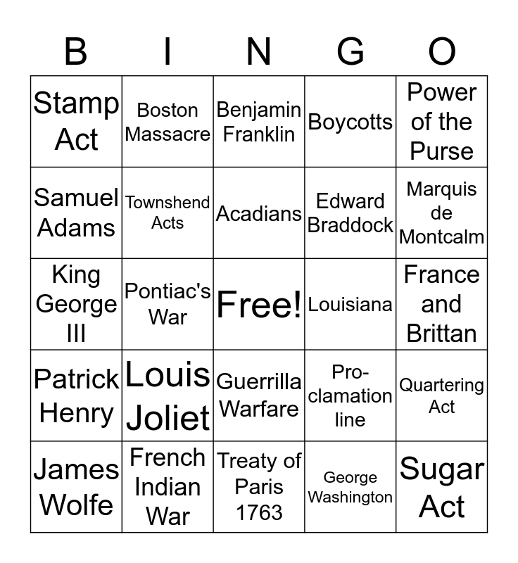 This bingo card has a free space and 24 words: Louis Joliet, French Indian War, Acadians, James Wolfe, Power of the Purse, Stamp Act, Samuel Adams, Boston Massacre, Louisiana, Guerrilla Warfare, Edward Braddock, King George III, Pro- clamation line, Quartering Act, Townshend Acts, George Washington, France and Brittan, Benjamin Franklin, Marquis de Montcalm, Pontiac's War, Sugar Act, Patrick Henry, Boycotts and Treaty of Paris 1763.