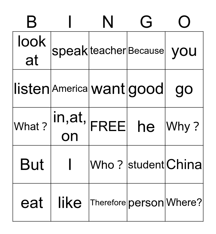 This bingo card has a free space and 24 words: I, like, want, eat, you, look at, listen, speak, he, Who?, good, What?, student, China, America, person, Why?, teacher, go, in,at, on, Where?, But, Because and Therefore.