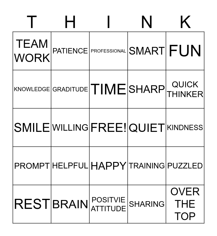 This bingo card has a free space and 24 words: HELPFUL, BRAIN, TIME, REST, FUN, TEAM WORK, KNOWLEDGE, PATIENCE, QUIET, HAPPY, SHARP, SMILE, TRAINING, PUZZLED, GRADITUDE, SHARING, KINDNESS, PROFESSIONAL, QUICK THINKER, WILLING, OVER THE TOP, PROMPT, SMART and POSITVIE ATTITUDE.
