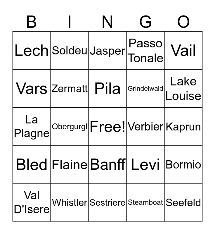 This bingo card has a free space and 32 words: Steamboat, St Anton, Obergurgl, Soll, Bled, Zermatt, Vail, Bormio, Soldeu, Courcheval, Pila, Jasper, Morzine, Les deux Alpes, Verbier, Tignes, Val D'Isere, La Plagne, Banff, Flaine, Levi, Borovets, Kaprun, Whistler, Seefeld, Passo Tonale, Grindelwald, Vars, Lech, Sestriere, Winter Park and Lake Louise.