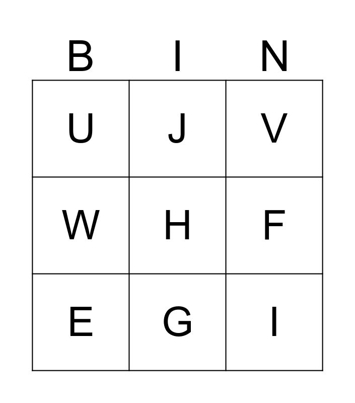 This bingo card has a free space and 8 words: F, V, J, E, U, I, W and G.