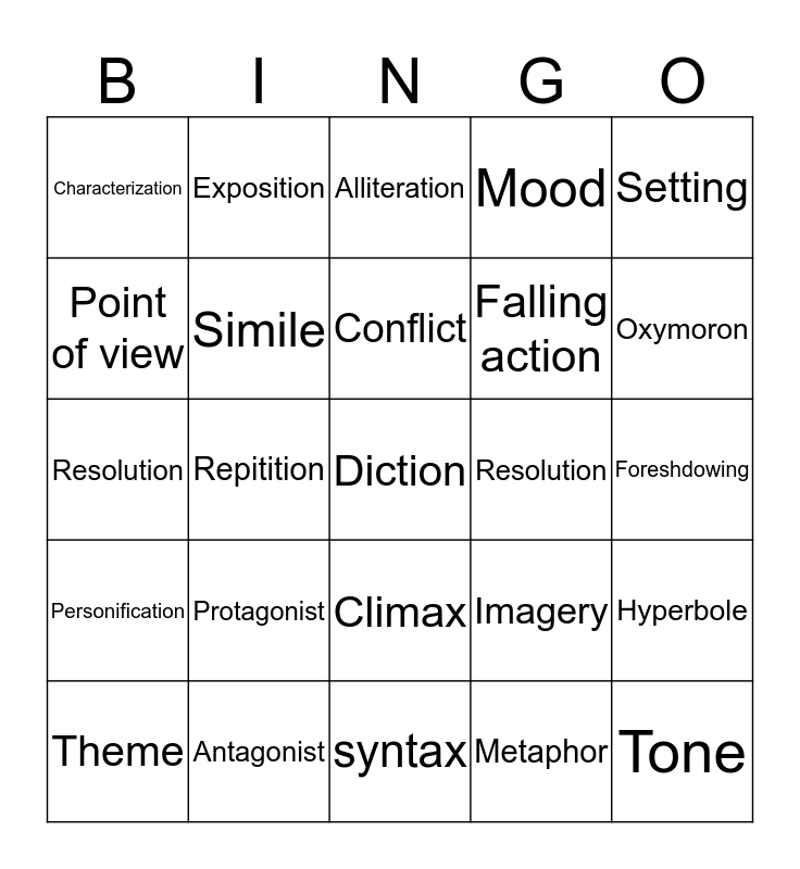 This bingo card has a free space and 24 words: Protagonist, Antagonist, Conflict, Theme, Setting, Characterization, Point of view, Exposition, Resolution, Climax, Falling action, Resolution, Imagery, Hyperbole, Simile, Metaphor, Foreshdowing, Alliteration, Oxymoron, Repitition, Tone, Personification, Mood and syntax.