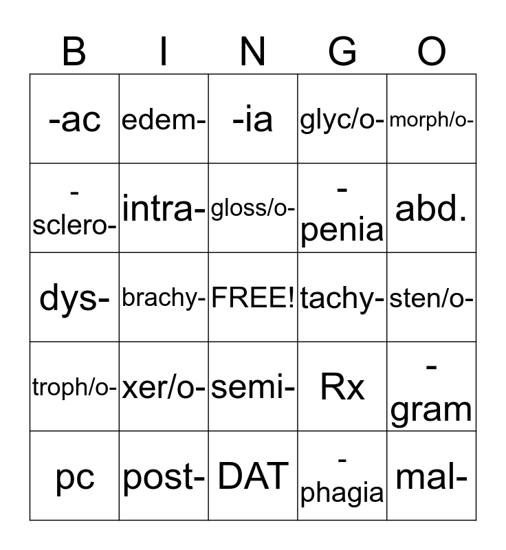This bingo card has a free space and 40 words: anti-, dys-, ecto-, intra-, post-, semi-, gloss/o-, stom-, morph/o-, troph/o-, brachy-, glyc/o-, mal-, sten/o-, tachy-, xer/o-, chol-, -ac, -emesis, -ia, -gram, -phagia, -penia, -sclero-, adeno-, -lith, entero-, osteo-, Dx, BP, NPO, pc, prn, Rx, abd., DAT, hx, Sx, edem- and N/V.