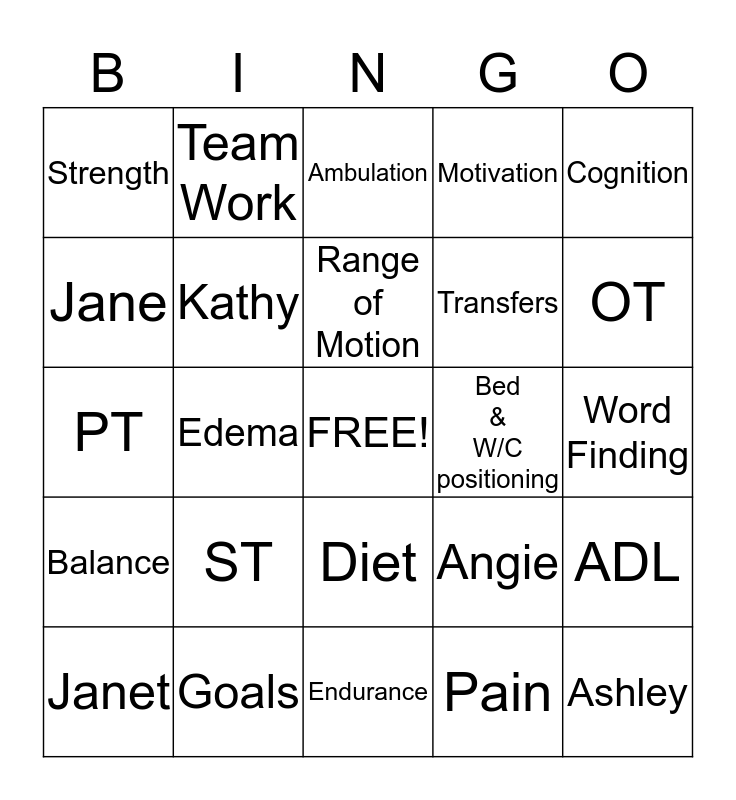 This bingo card has a free space and 24 words: Janet, ST, Range of Motion, Pain, Cognition, Strength, Team Work, Ambulation, Bed & W/C positioning, Word Finding, PT, Kathy, Angie, ADL, Jane, Goals, Endurance, Motivation, OT, Balance, Edema, Diet, Transfers and Ashley.