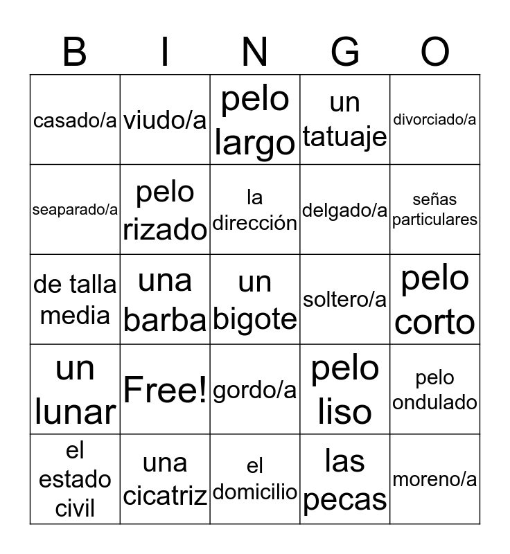 This bingo card has 25 words: Free!, el domicilio, la dirección, el estado civil, divorciado/a, casado/a, seaparado/a, viudo/a, soltero/a, gordo/a, delgado/a, de talla media, pelo liso, pelo ondulado, pelo rizado, moreno/a, pelo corto, pelo largo, señas particulares, una barba, un bigote, una cicatriz, un lunar, un tatuaje and las pecas.