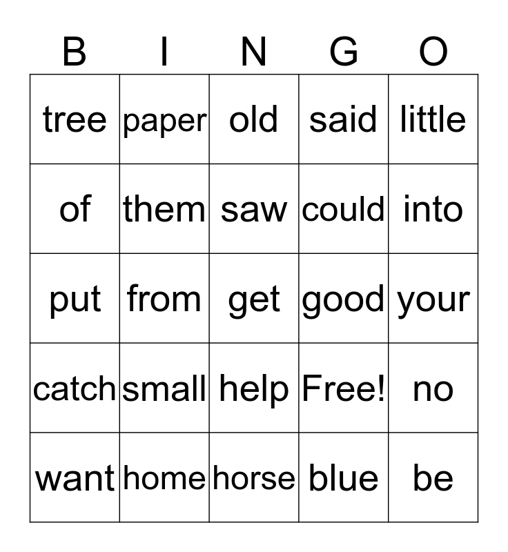 This bingo card has 27 words: Free!, be, could, horse, of, old, paper, catch, good, no, put, said, want, home, into, many, them, saw, small, tree, your, blue, from, get, help, little and use.