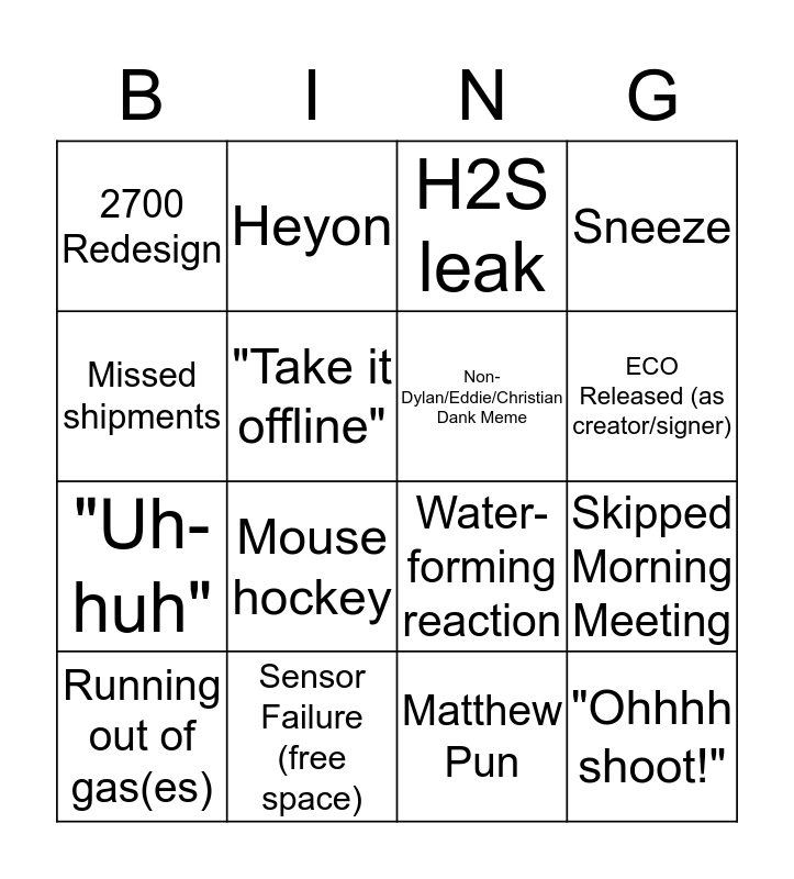 This bingo card has 21 words: Sensor Failure (free space), Let's Talk!, Heyon, Whitepaper, Matthew Pun, Non-Dylan/Eddie/Christian Dank Meme, 2700 Redesign, H2S leak, Water-forming reaction, ECO Released (as creator/signer), "Uh-huh", Sneeze, "Ohhhh shoot!", "Let's circle back", "Take it offline", Jeffrey needs tooling, Running out of gas(es), Mouse hockey, Missed shipments, Skipped Morning Meeting and Extension duck-duck-goose.