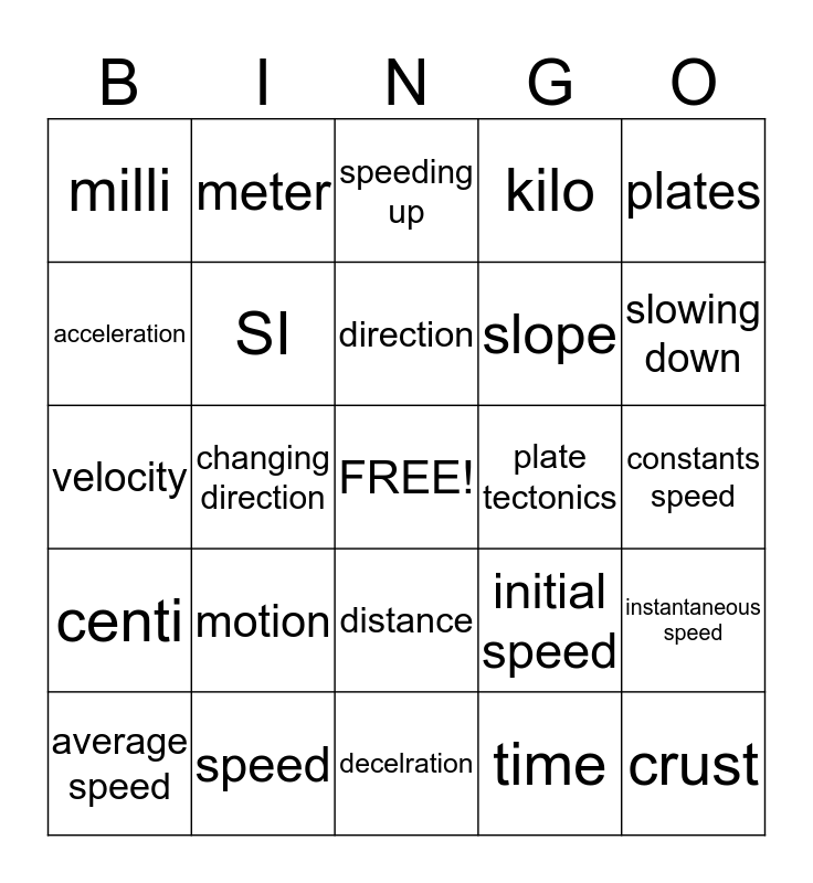 This bingo card has a free space and 24 words: motion, speed, direction, average speed, plates, milli, acceleration, meter, plate tectonics, distance, slope, velocity, initial speed, instantaneous speed, SI, time, constants speed, speeding up, slowing down, changing direction, crust, centi, kilo and decelration.