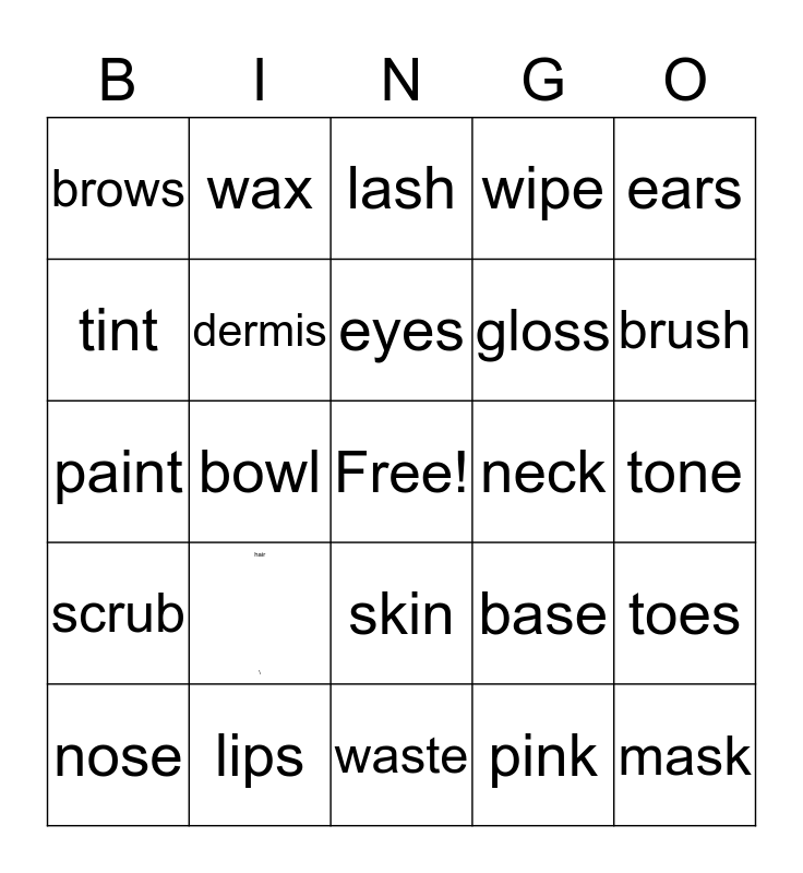 This bingo card has a free space and 24 words: hair \, lips, eyes, nose, ears, brows, tint, wax, neck, skin, gloss, paint, base, toes, dermis, pink, tone, lash, brush, bowl, mask, scrub, wipe and waste.
