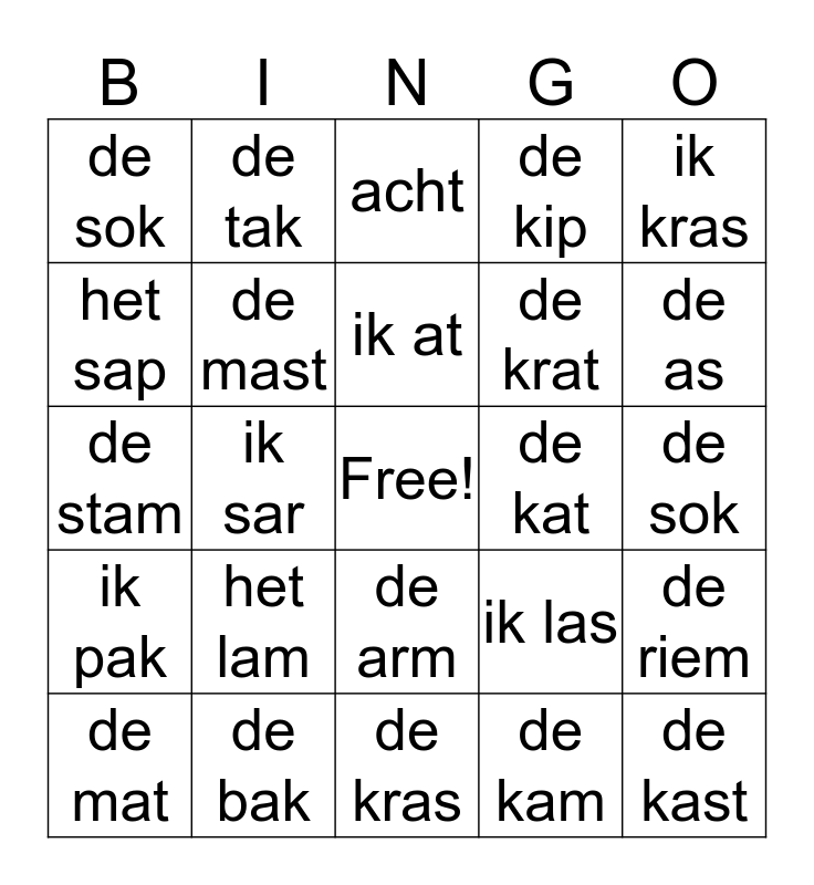 This bingo card has a free space and 49 words: de kar, de kast, de kin, de kras, het lam, de pas, de tak, de kas, het sap, star, de mast, de kip, de riem, ik las, de sla, sas, ik at, de kat, ik sta, ik kras, ik sar, de kam, de sok, de krat, het ras, de as, de mat, de plas, de arm, ik pak, tam, het gas, de tast, de dam, de bak, de kak, de tas, de klas, de sok, de mast, ik sla, de rat, ik stak, de mam, de stam, acht, ik at, ik sta and de man.